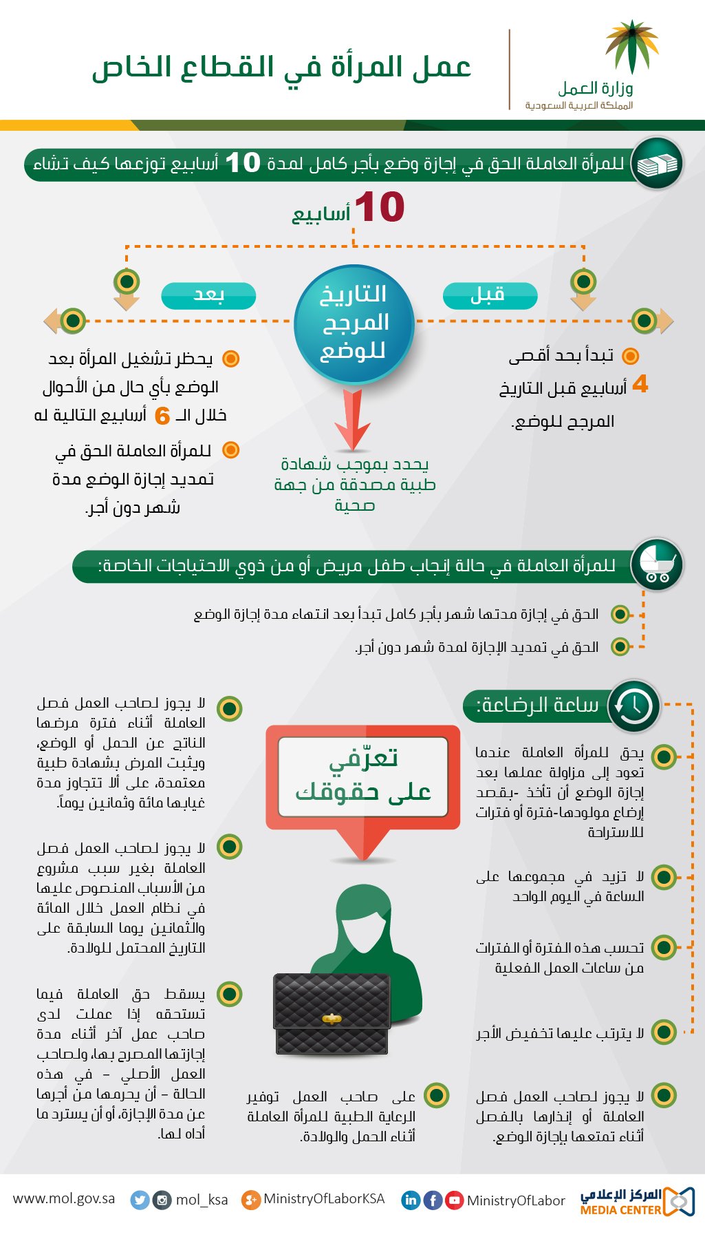 قالت وزارة العمل السعودية أنه يحق للمرأة العاملة في القطاع الخاص الحصول على إجازة وضع 10 أسابيع براتب كامل حال كان لديها 3 سنوات في العمل ونقلت صحيفة.
