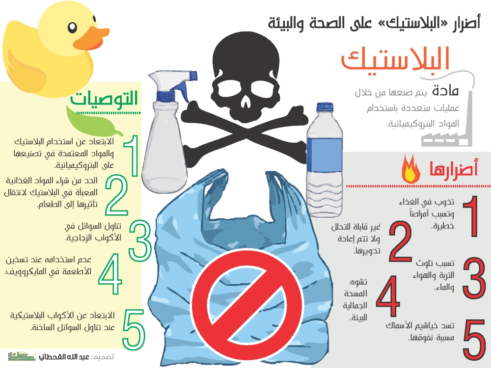 تأثير البلاستيك على التربة. تراكم المواد البلاستيكية الغير قابلة للتحلل في التربة يؤدي إلى تلوث التربة وفقدانها لخصوبتها على المدى الطويل نتيجة لتراكم مادة الديوكسين في التربة ومنع النباتات والأعشاب من أخذ ما تحتاجه من أشعة الشمس. و لفت الى الآثار السلبية لاكياس البلاستيك على الانسان والحيوان والتربة والهواء. ويؤثر التلوث البلاستيكي بشكل ضار على الأراضي والمجاري المائية والمحيطات وعلى الكائنات الحية ولا سيما الحيوانات البحرية من خلال ان تعلق فيه الكائنات الحية أو ابتلاعها للنفايات البلاستيكية أو بتعرضها للمواد الكيميائية داخل اللدائن التي تسبب اضطرابات في الوظائف. ان قمنا بحرقه فذلك يؤدي الى انبعاثات سامة وان طمرناه يسمم التربة ويخنقها وان رميناه عشوائيا تأكله الحيوانات وتموت.