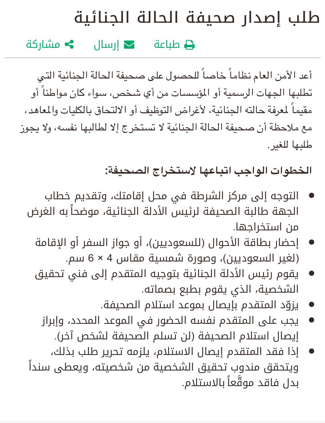 صحيفة الحالة الجنائية السعودية. في ظل الأزمة العالمية الحالية بات استخراج صحيفة الحالة الجنائية من وزارة الداخلية أمر صعب للغاية خاصة مع توقف تلك الخدمة منذ فرض حظر التجول منع ا للتجمعات وعدم إتاحة استخراج تصريح تنقل بين المدن. يستطيع المواطن استخراج صحيفة الحالة الجنائية الفيش عن طريق الماسح الضوئي خلال 24 ساعة وذلك بمبلغ 45 جنيها. طلب رد الاعتبار. مزاولة نشاط الحراسات الأمنية المدنية.