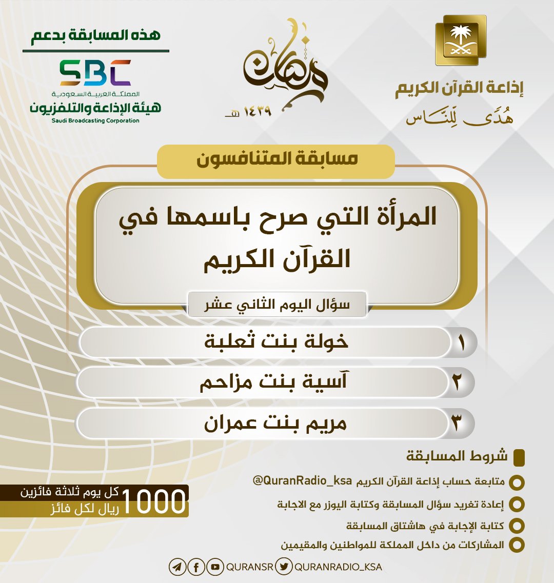 اذاعة القرأن الكريم السعودية هى الافضل بين اقرانها من الاذاعات الدينية الاثنين أغسطس 18 2014 2 05 00 ص غير معرف يقول. احتفلت إذاعة القرآن الكريم في المملكة العربية السعودية اليوم بمرور 50 عام ا على تأسيسها حيث جاء افتتاحها بتوصية كريمة من الملك فيصل بن عبدالعزيز ليكون البث الإذاعي دعم ا جديد ا للدعوة لدين الله وانطلاق ا من أعظم. الأمانة العامة لمسابقة الملك عبدالعزيز لحفظ القرآن الكريم تقيم مسابقة ثقافية للمشاركين. معرفة رقم المتنافسون للمشاركة في مسابقة البرنامج عبر إذاعة القرآن الكريم في المملكة العربية السعودية والتي تقدم مسابقات هادفة وجوائز قيمة بالتعاون مع مؤسسة أوقاف الشيخ محمد بن عبد العزيز الراجحي رحمه الله ويمكن متابعة البرنامج بشكل يومي خلال شهر رمضان المبارك شهر الخير والبركات وسنوضح كيفية المشاركة في المسابقة والمنافسة للحصول على الجوائز النقدية الضخمة بخلاف القيمية الإثرائية للمشاركة في المسابقة الدينية في علوم القرآن الكريم والسنة.
