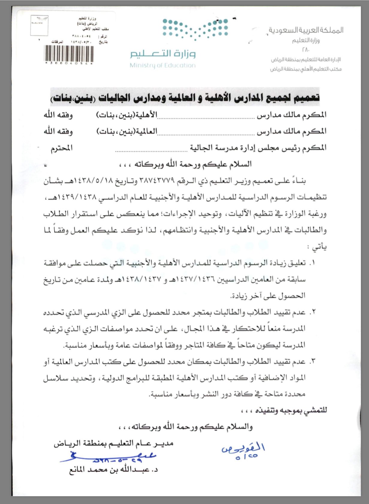 2669555 11 00966 فاكس. أكد مدير مكتب التعليم الأهلي بمنطقة الرياض أنس الأحيدب أن مكتب التعليم الأهلي شرع في خطوات عمل ومتابعات تمت لكل مبنى غير تعليمي في خطة خاصة به للتحول أو الإغلاق من حين صدور التعميم الوزاري المنظم في إيقاف منح التراخيص للمدارس الأهلية والأجنبية ذات المباني غير المصممة لأغراض تعليمية وإعطاء المدارس القائمة في مبان غير تعليمية فرصة عامين للانتقال لمبان تعليمية.