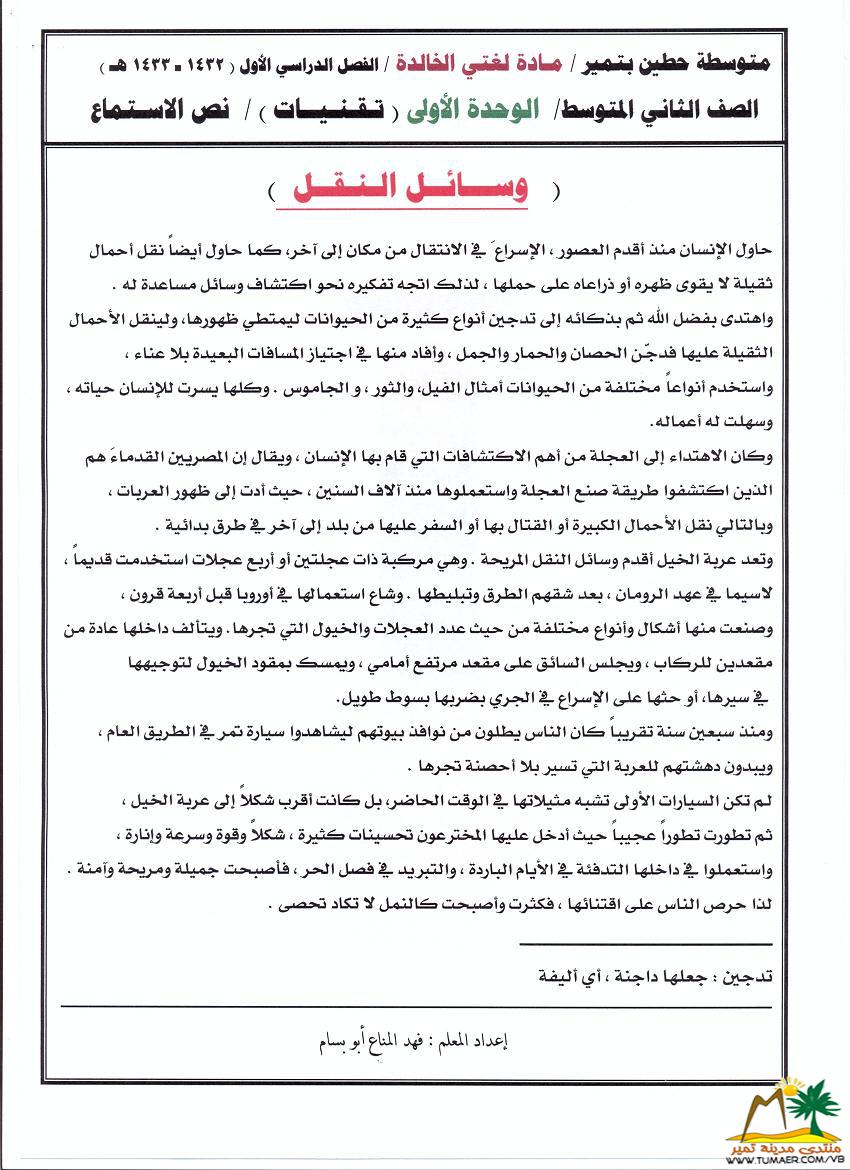 نص الاستماع وسائل النقل ثاني متوسط. وسائل النقل في مادة لغتي الخالدة لطلاب الصف الثاني المتوسط الفصل الدراسي الثاني الوحدة الرابعة. نقدم إليكم عرض بوربوينت لدرس نص الاستماع. مادة لغتي الصف الثاني متوسط الفصل الدراسي الأول الوحدة الأولى إعداد الأستاذ أحمد معمور العسيري.